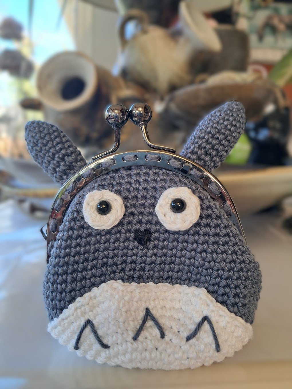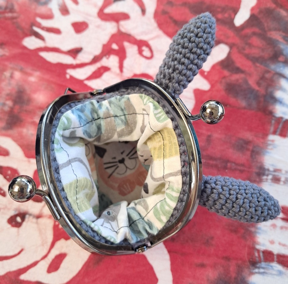 Pour accompagner Totoro, que j’adore, voici un porte-monnaie à son effigie réalisé au crochet et doublé d’un tissu coton à motifs « chats ».